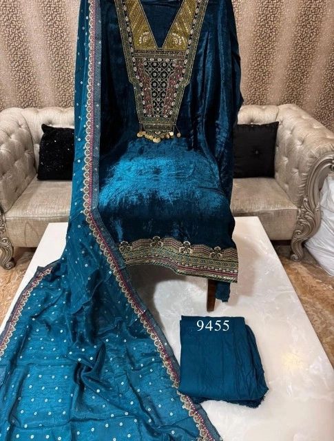 Elevate your festive and wedding look with the Aiqa-Qealiz Blue Velvet Embroidery Suit, a perfect blend of luxury and elegance. Crafted from pure viscose velvet, this blue velvet unstitched suit set exudes richness and charm. The top features intricate fancy embroidery with delicate handwork, giving it a royal and timeless appeal. Paired with a pure Bemberg chinon weave dupatta adorned with elegant work, and a pure viscose pashmina solid bottom, this ensemble offers unmatched comfort and style.