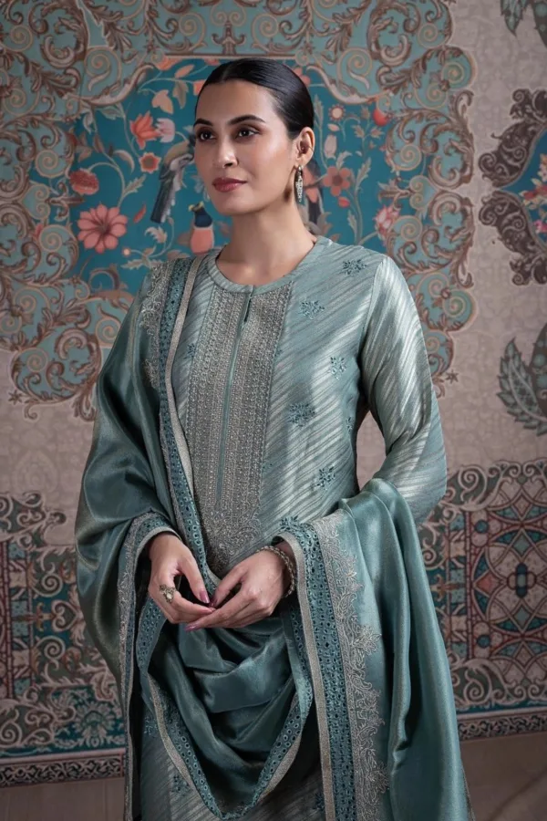 Elevate your festive look with this elegant Naariti party wear silk suit. The top is crafted from pure silk jacquard with delicate handwork on the neckline, adding a touch of sophistication. The bottom is made of luxurious Upada silk, offering a graceful drape. Completing the ensemble, the dupatta is pure tissue silk with subtle embroidery and a stylish border, perfect for weddings, parties, or special occasions.