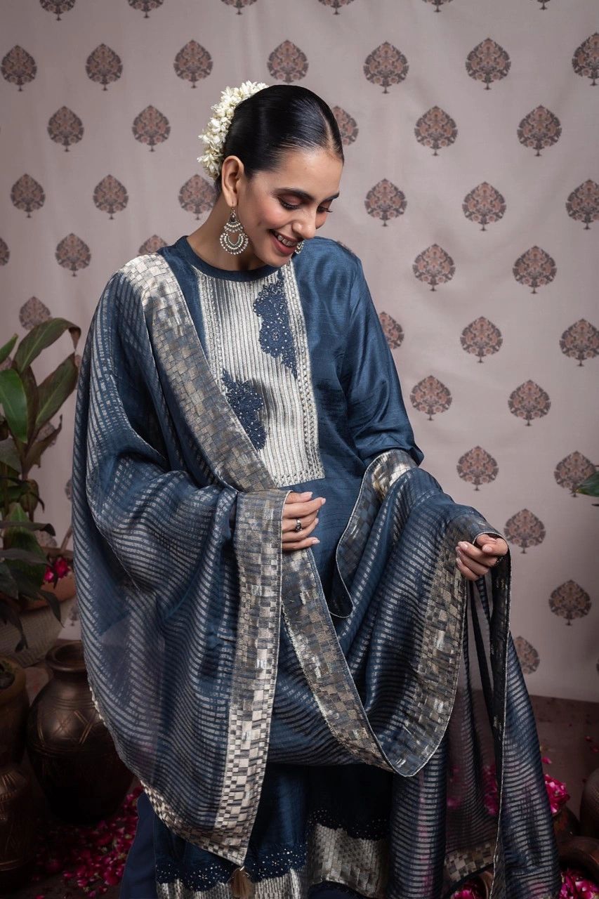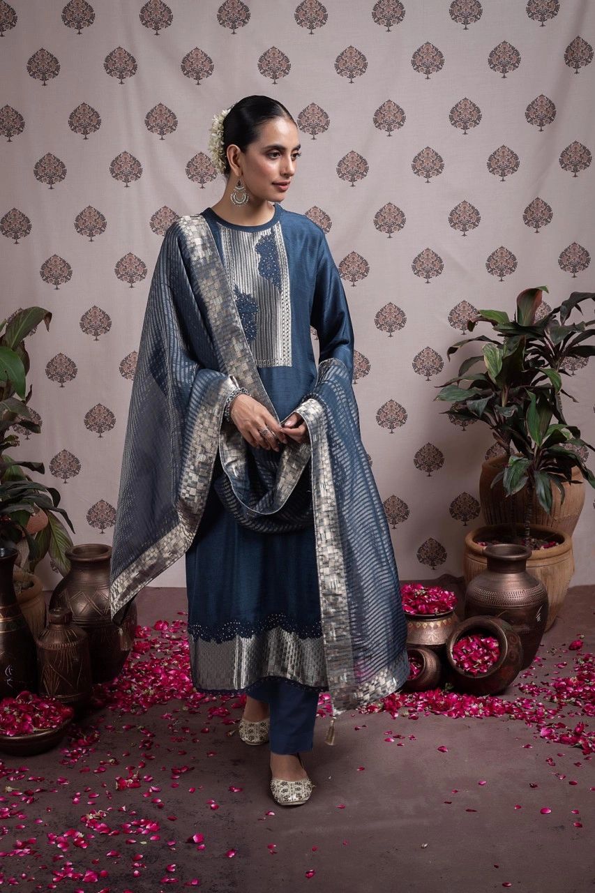 Elevate your festive and party look with the Naariti Parishi Blue Silk Suit, a masterpiece that blends traditional grace with luxurious craftsmanship.