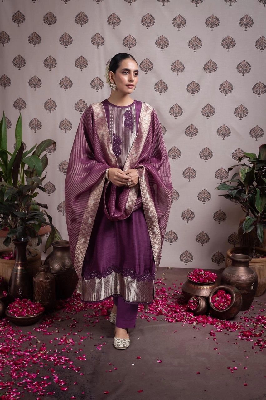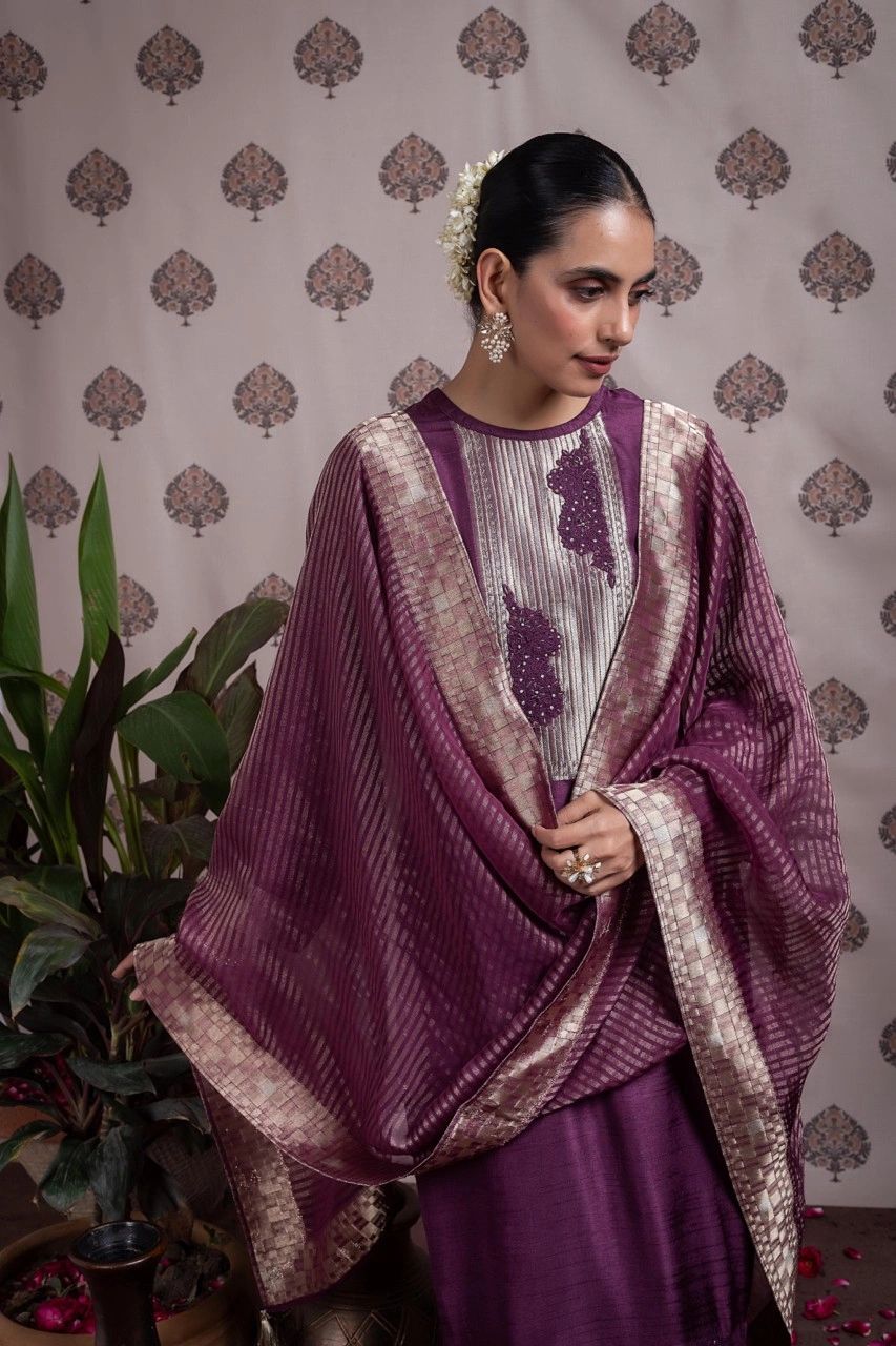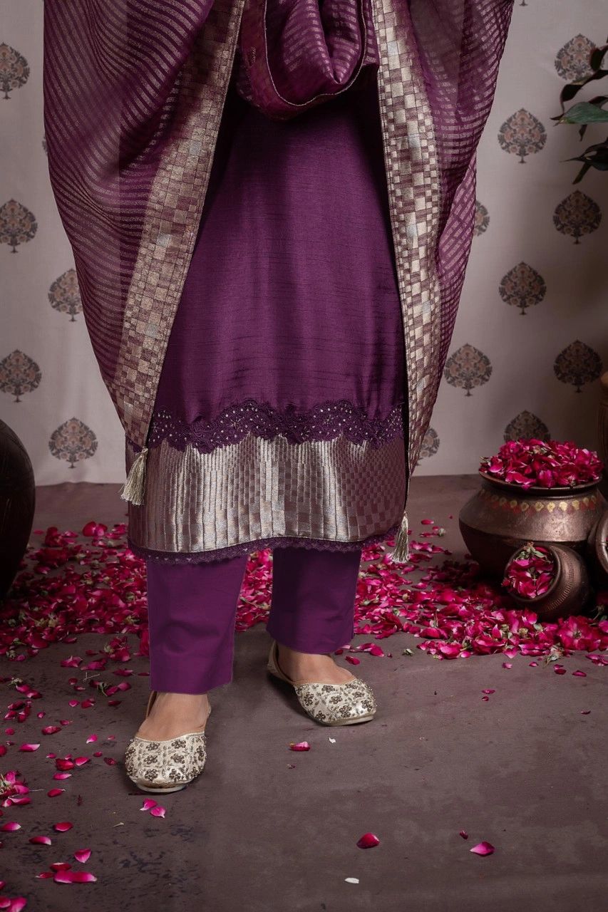 Elevate your festive and party look with the Naariti Parishi purple Silk Suit, a masterpiece that blends traditional grace with luxurious craftsmanship.
