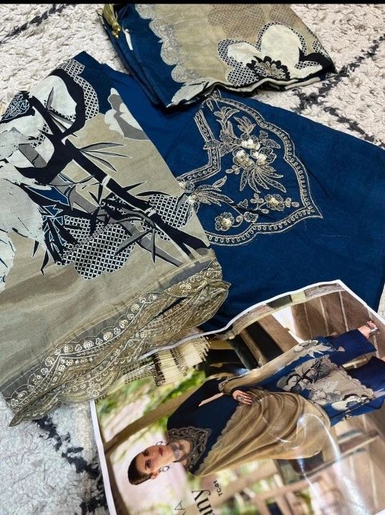 With refined prints, premium muslin fabric, and satin finishing, this design truly represents the charm of the Varsha party wear suits collection. It combines the grace of silk-inspired styling with the comfort of lightweight fabric.